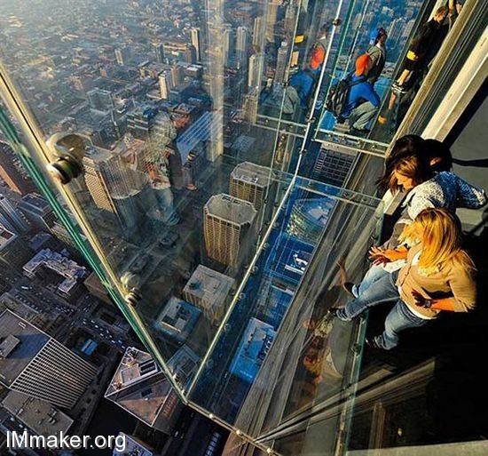 这间透明的开放式窗台位于芝加哥威利斯大厦的103层,游人可以站在上面欣赏前所未有的城市天际线景色,不过对于恐高者来讲,却是一项极为疯狂的挑战。